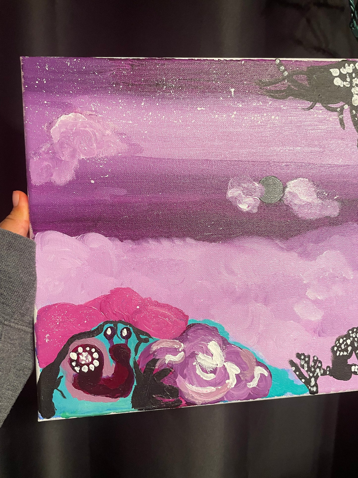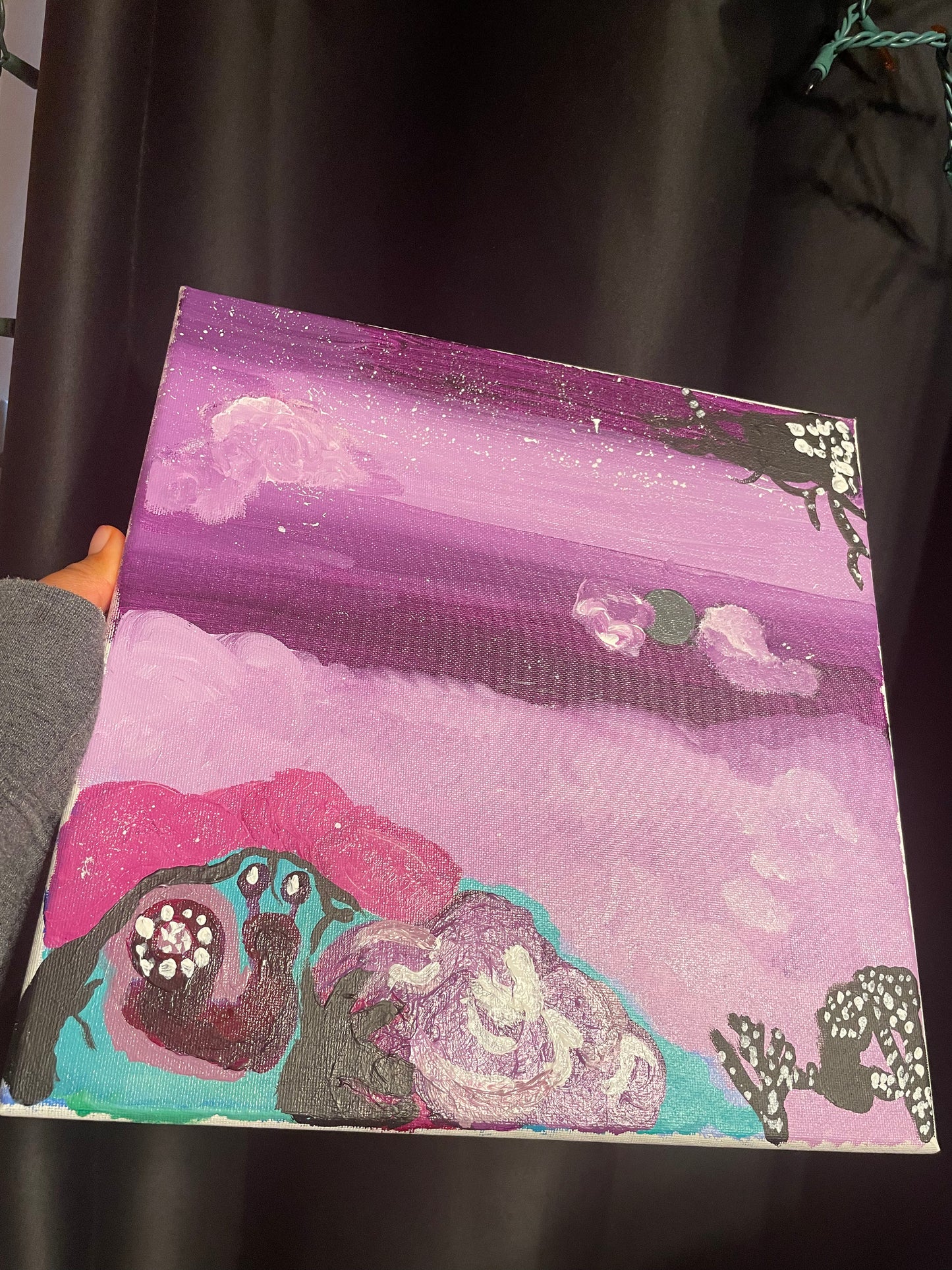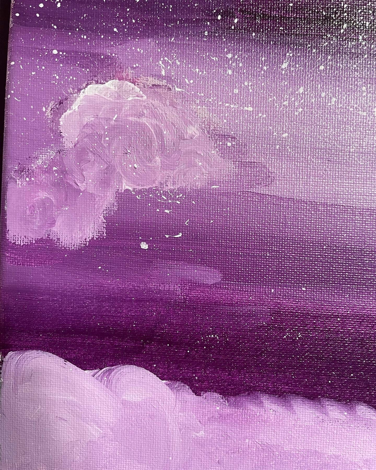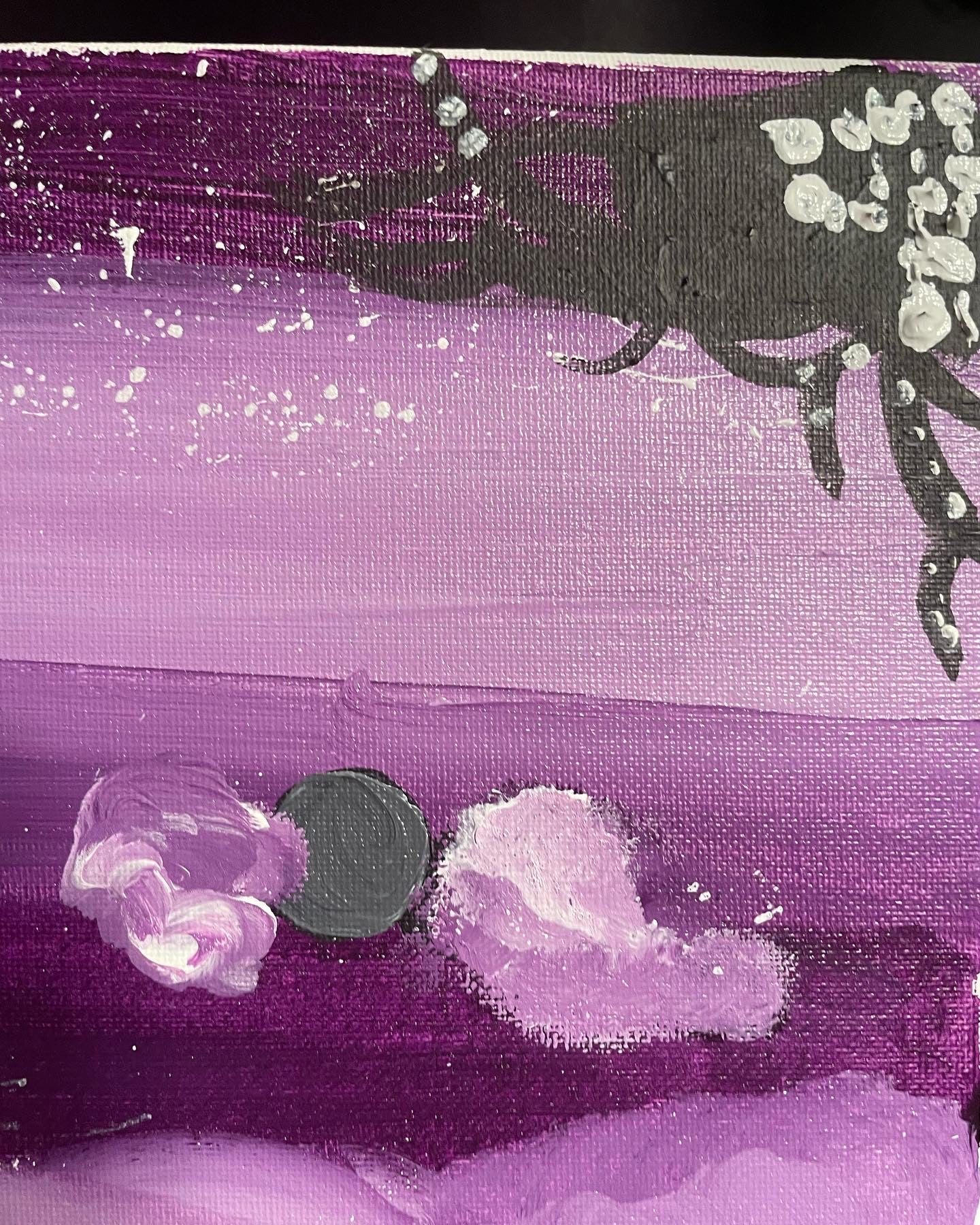 Purple Night sky, fluffy purple clouds, down hill a snail under a tree looking out at the dark moon! The nightly view is very peaceful! Inspired by purple and nature!