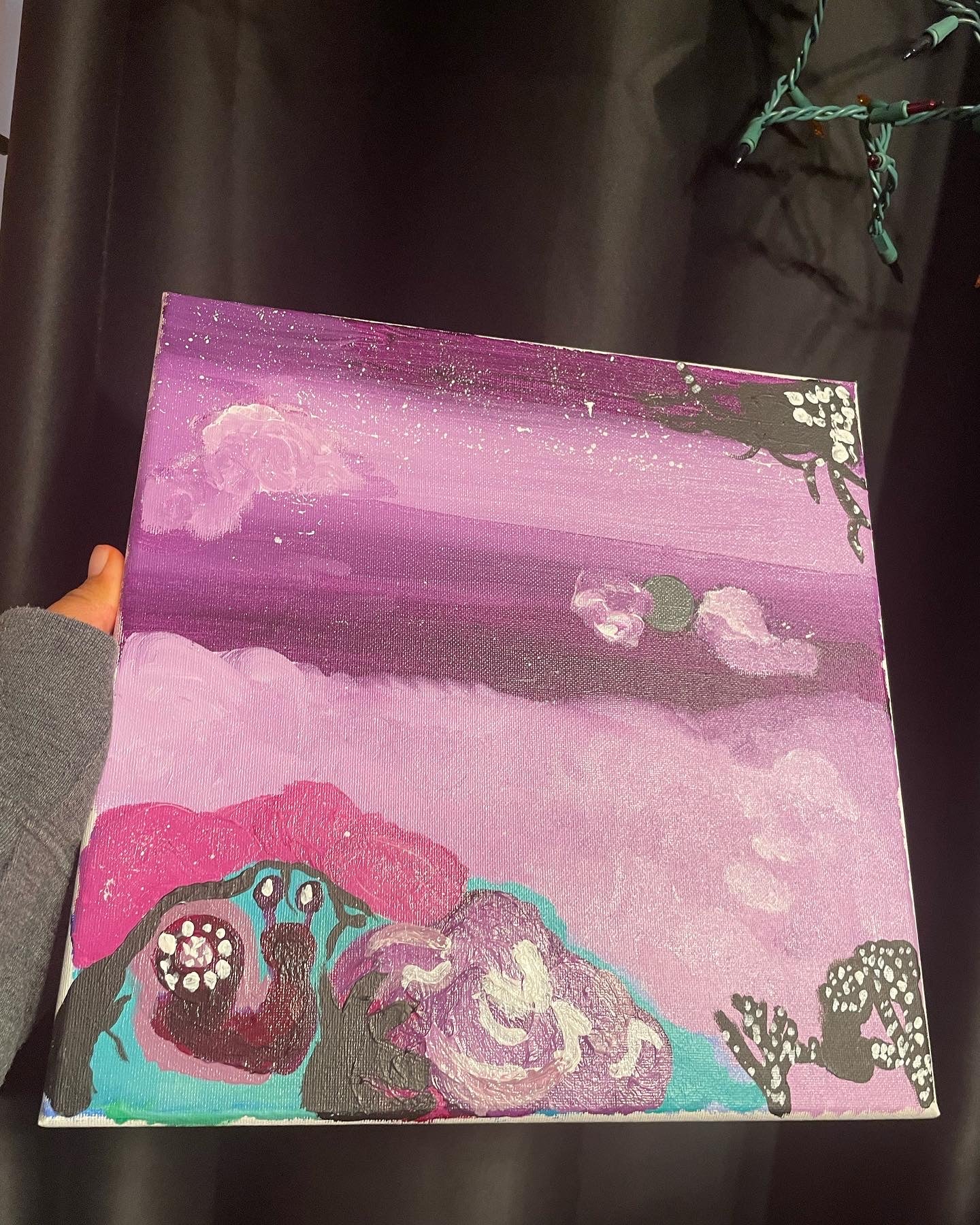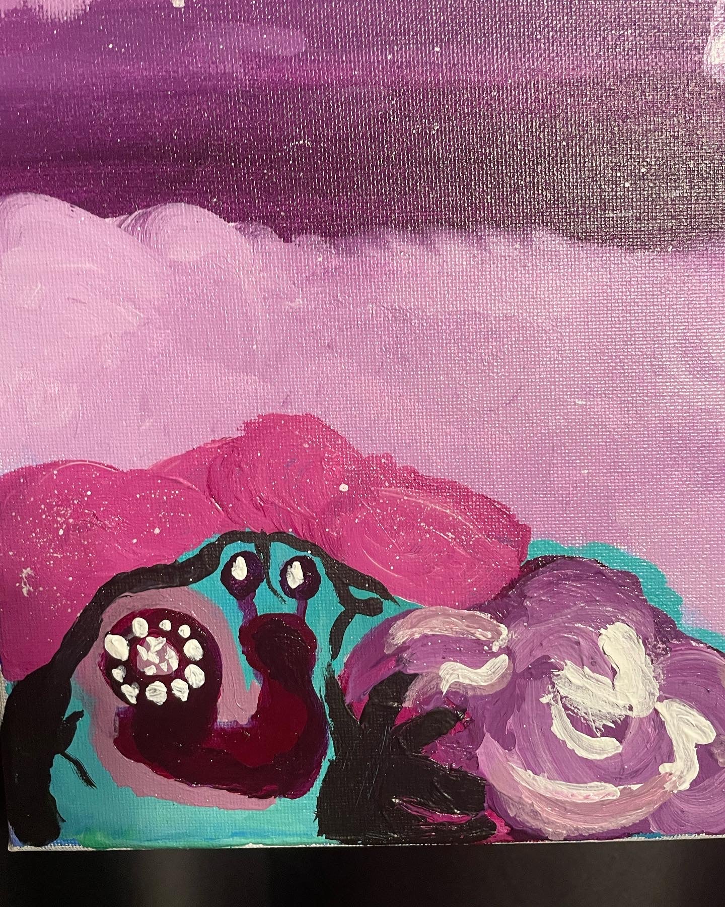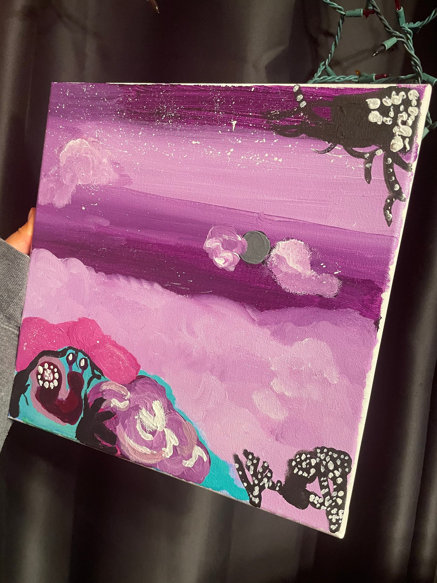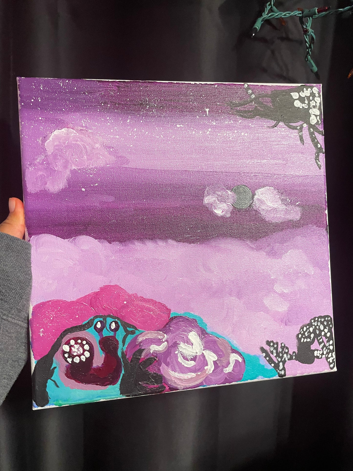 Purple Night sky, fluffy purple clouds, down hill a snail under a tree looking out at the dark moon! The nightly view is very peaceful! Inspired by purple and nature!