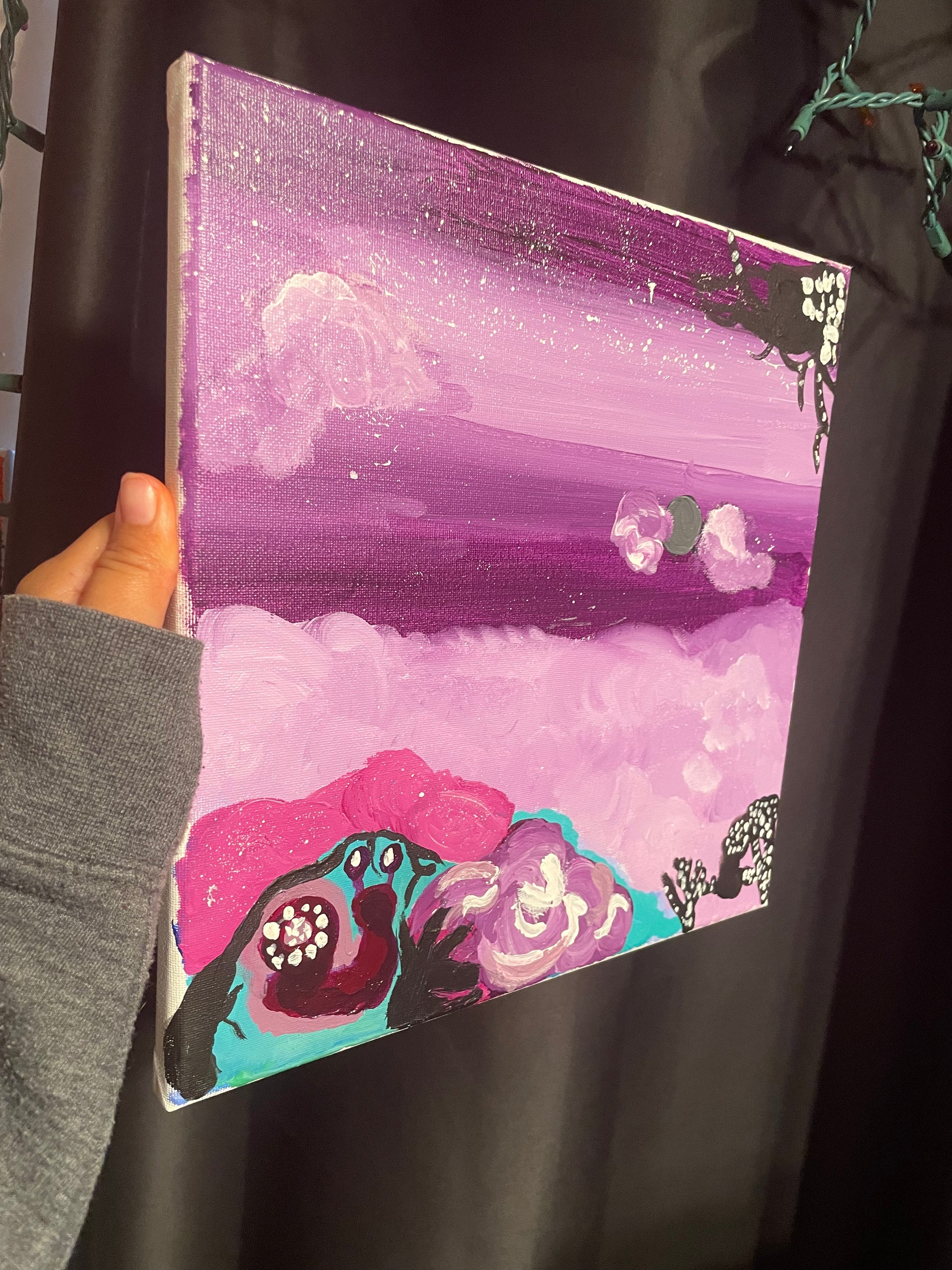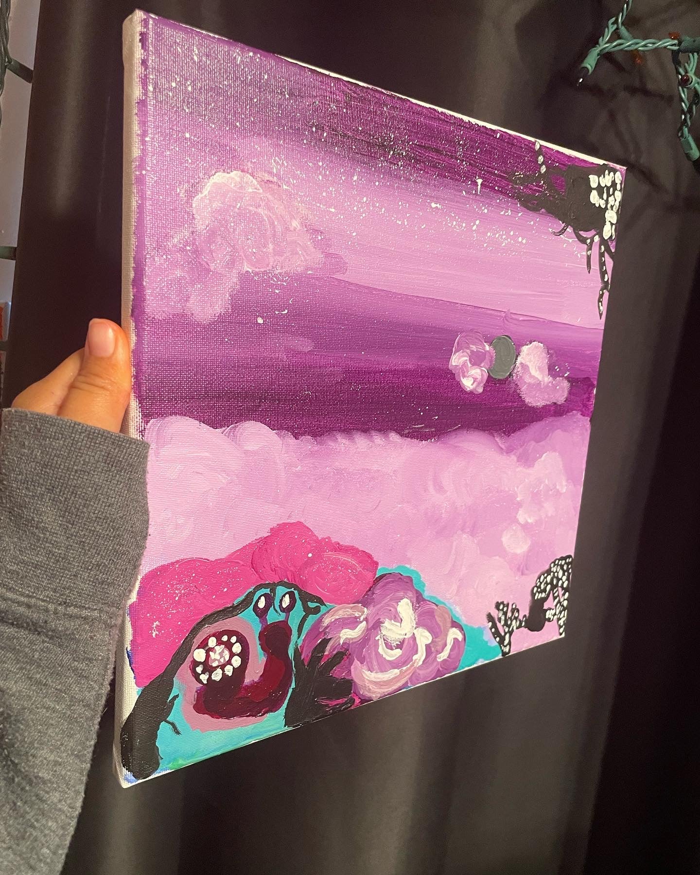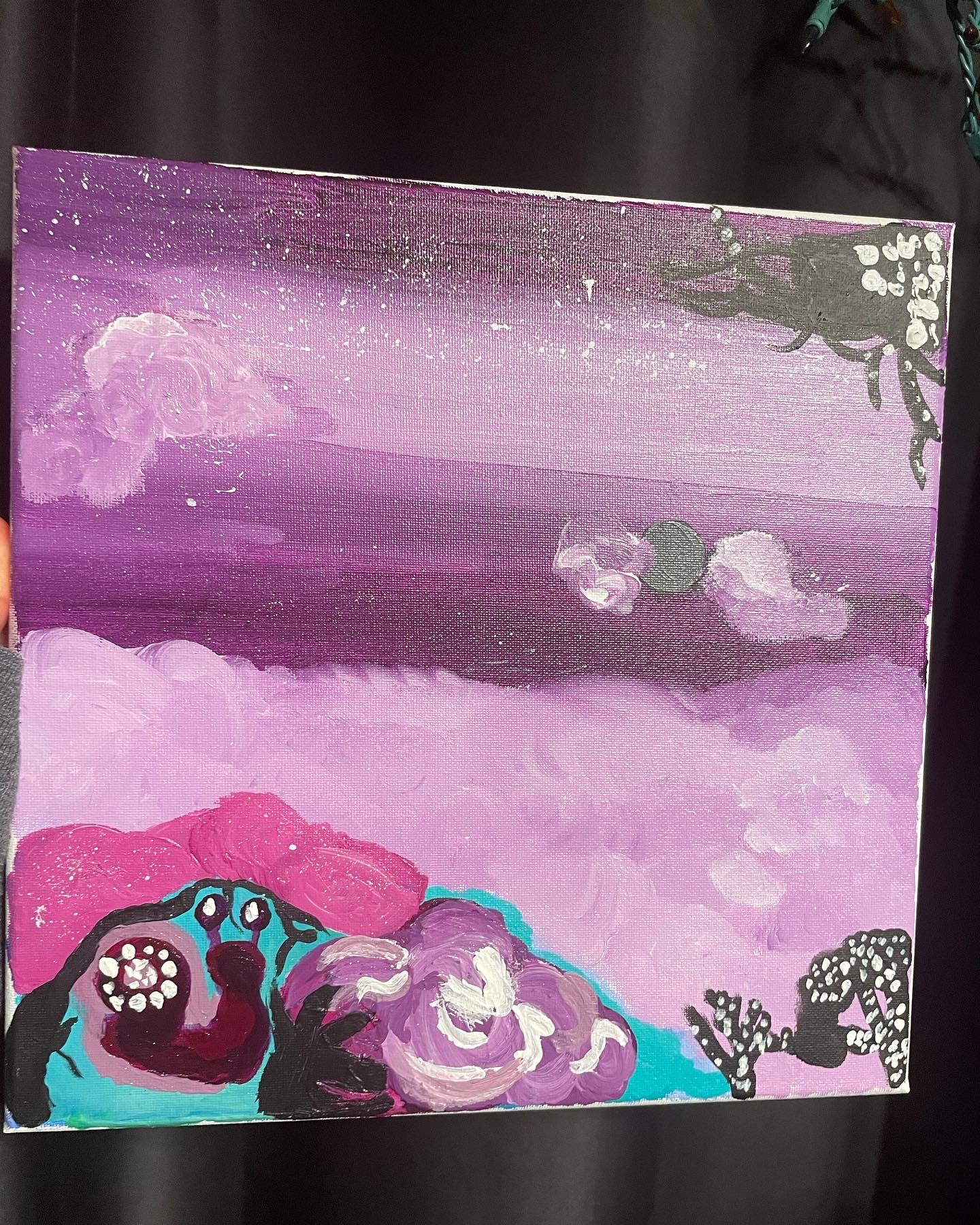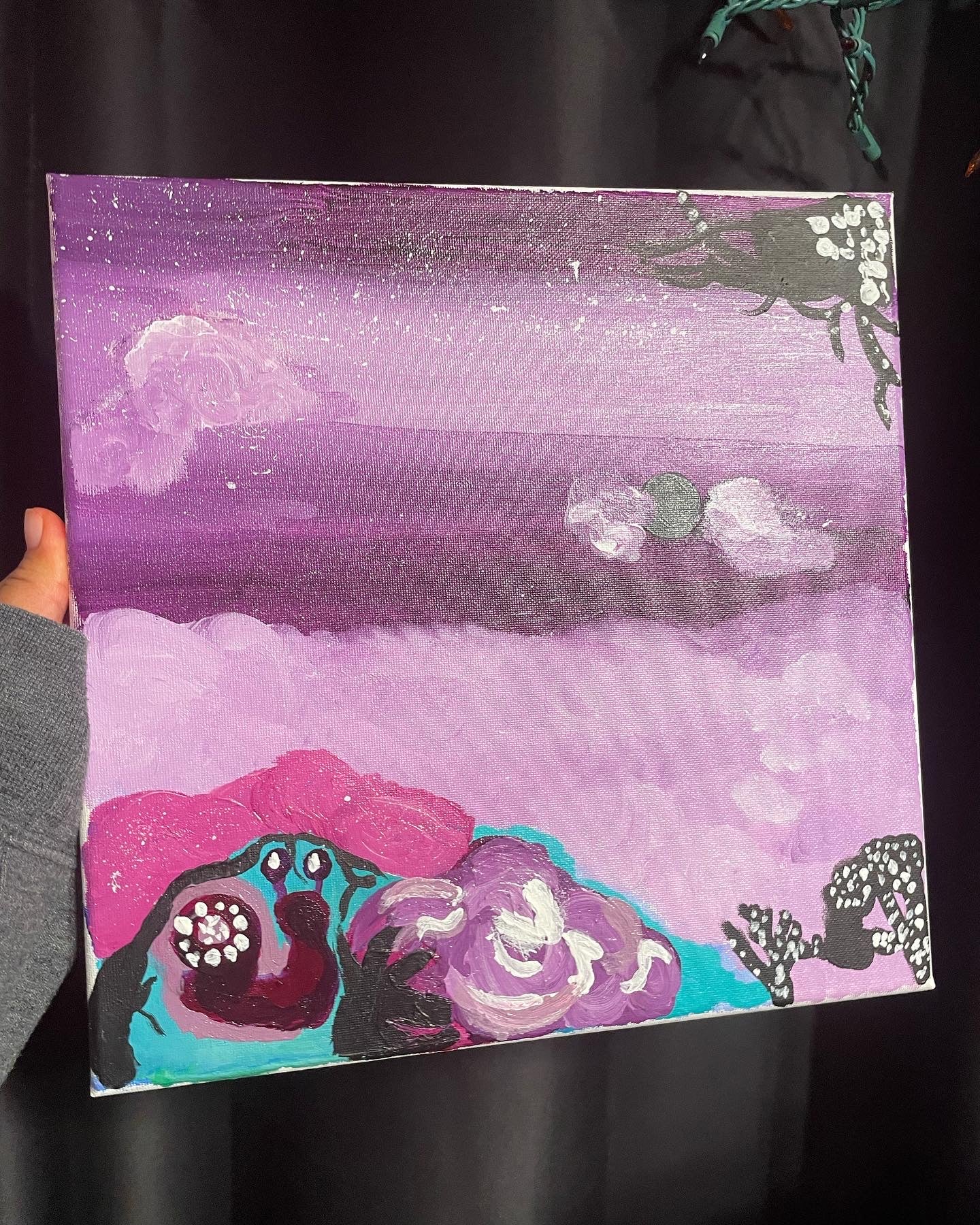 Purple Night sky, fluffy purple clouds, down hill a snail under a tree looking out at the dark moon! The nightly view is very peaceful! Inspired by purple and nature!